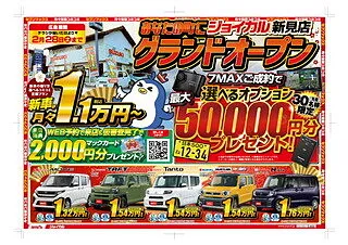 2/1から、全国のジョイカル店舗で、毎週抽選で最大10万円の購入資金などが当たるキャンペーンが始まります!ジョイカル新見店では、2月末まで審査完了でマックカード2,000円分プレゼントや、オプション50,000円分プレゼントもやってますので更にお得になります!是非この機会に新車に乗りかえませんか?まずは、ウェブから来店予約!!詳しくはチラシをクリック~!